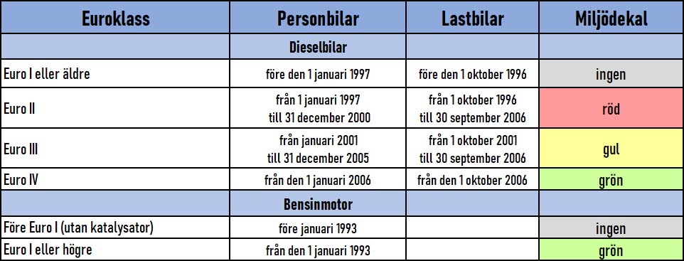 Du tar enkelt reda på vilken miljöplakett ditt fordon får i följande tabell. (Euronivå står för EEC/EC:s utsläppsdirektiv som framgår av ditt registreringsbevis.)