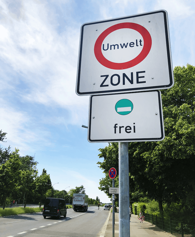 Miljözoner omgärdas av skyltar med texten “Umwelt ZONE” som på bilden. En tilläggsskylt undertill med texten “frei” visar vilken sorts miljöplakett som behövs.