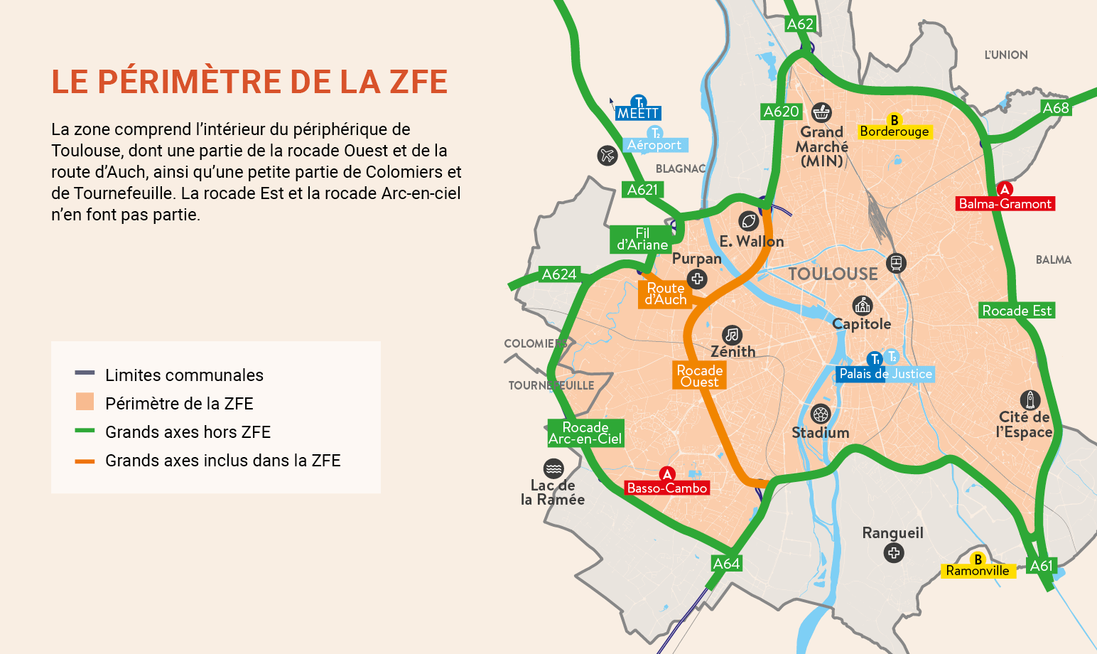 Miljözonen i Toulouse avgränsas av ringvägen Périphérique och täcker merparten av stadens yta. Motorvägarna A62, A61 och A620 ligger utanför zonen.